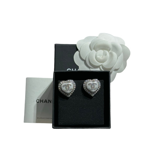 CHANEL HEART-SHAPED CC LOGO SILVER EARRINGS WITH CRYSTAL [3001011]